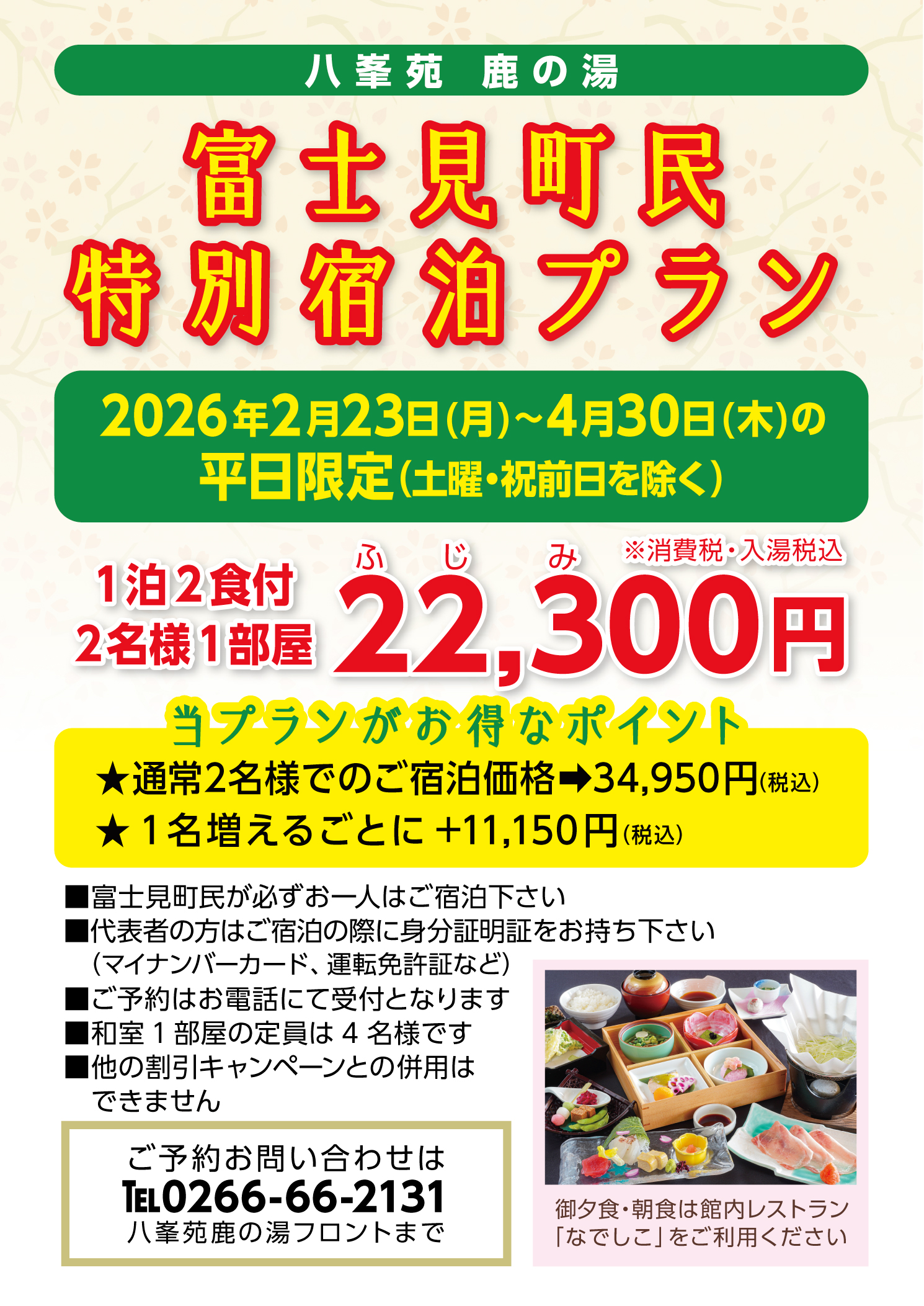 BLOG ブログ 【期間限定】富士見町民特別宿泊プラン 2026.2.23 2月23日は「ふじみの日」ということで、本日より「富士見町民特別宿泊プラン」を開始いたしました。 富士見高原リゾートがある地元の富士見町民の皆様に感謝を込めてのプラン価格となっております。 ご家族、ご友人などと一緒に、身近な場所での小旅行をお楽しみください(^^♪ 前の記事 一覧に戻る