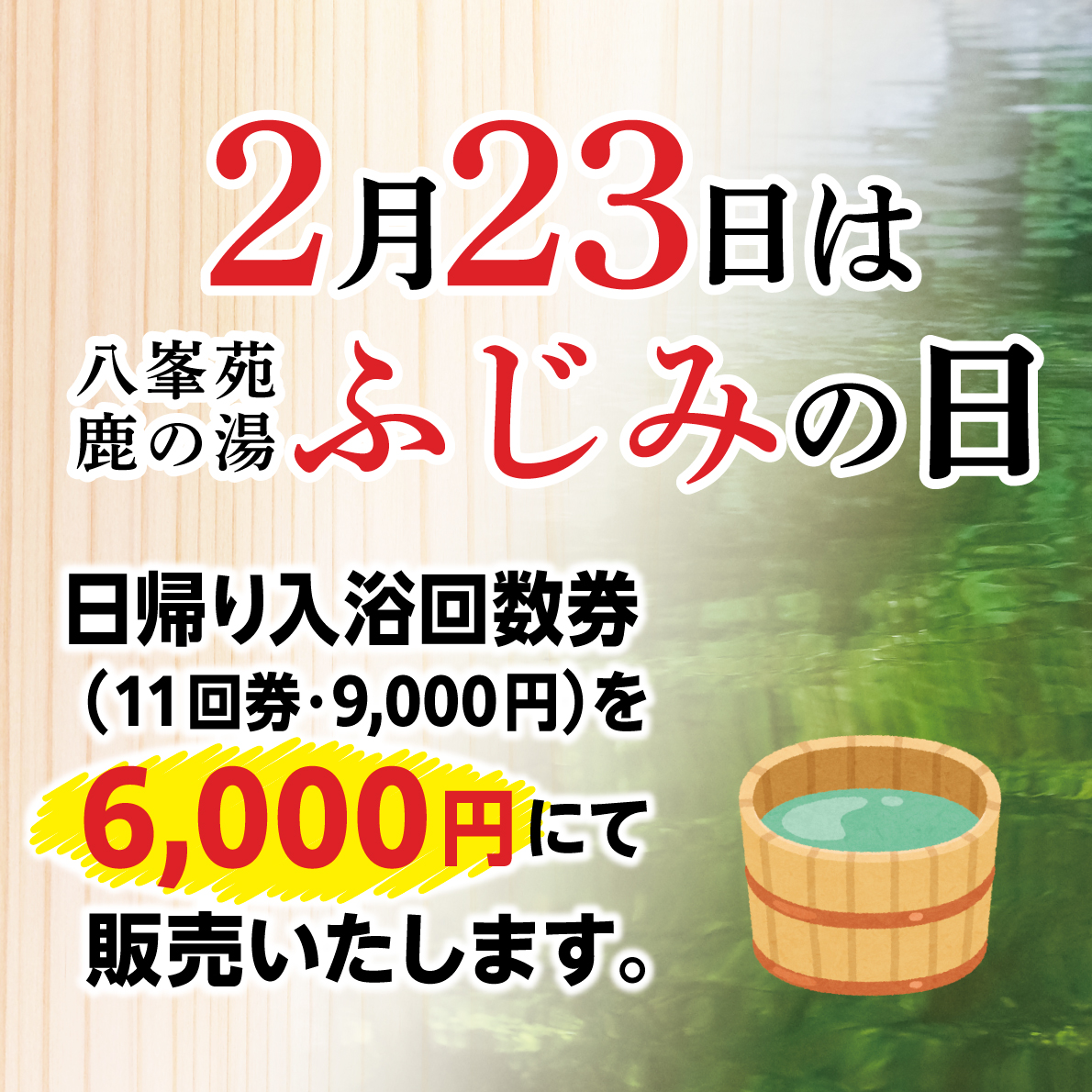 さて、いよいよ来週月曜日【2月23日】は鹿の湯恒例、日帰り入浴回数券特別料金での販売日【ふじみの日】でございます。